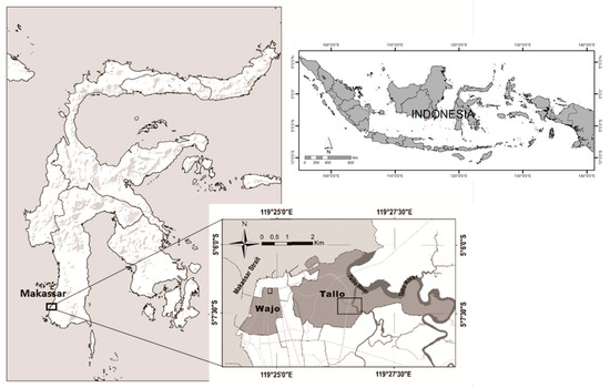 Sulawesi island, Indonesia, the locations of urban gold workers (two square boxes) in Tallo and Wajo sub-districts, Makassar.