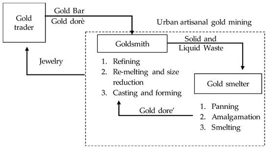The activities of gold workers in Makassar city have operated for over 40 years. The activities of the urban artisanal gold mining can be divided into two groups, goldsmiths and gold smelters, as shown in Figure 2. Edible vegetables and fruits are planted in the yard. In addition to tap water from the domestic water system, artesian wells and open wells are used for daily life, such as drinking water and food preparation. Local fishes are produced in brackish water ponds located in the Tallo river bank.