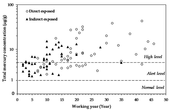 The directly- and indirectly-exposed groups have persistently worked in smelting areas as indicated by the working years. The working years also reflects the duration of mercury exposure. Figure 3 shows a significant and positive correlation between working years of either directly-exposed (Spearman, r = 0.54; p < 0.000) or indirectly-exposed (Spearman, r = 0.57; p < 0.000) and the total mercury concentration. This result reveals that the exposed group who works longer had an increasing tendency in the mercury level.