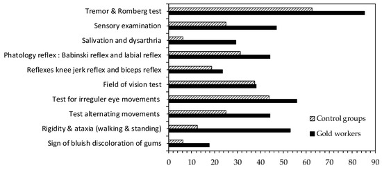 The neurological examination results of 34 gold workers and 17 control group subject showed various neurological disturbances, as shown in Figure 4. The most prevalent symptoms among the gold workers were tremors in the tongue, eyelid, finger, nose, pouring, posture holding, and Romberg test, reaching 85% occurrences, whereas 44%–56% had positive findings for unbalanced rigidity and ataxia, pathology reflex, sensory disturbance, constricted field of vision, and slow knee jerk and bicep reflexes. The prevalent symptoms of the control group were tremors in the tongue, eyelid, finger nose, pouring, posture holding, and Romberg test reaching 62% occurrences, while tests of irregular eye movement, field of vision, knee jerk reflex and biceps reflex were the second dominant symptoms with 31%–44% occurrences.
