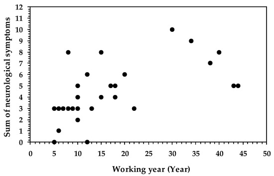 On average, the UAGM workers suffered four out of 10 symptoms. It is found that a gold worker who had been working for many years experienced many more symptoms than those who had worked for only a few years. A clear indication of this reasonable correlation (Pearson, r = 0.59; p = 0.000) was found by plotting the working years and the sum of positive findings for neurological symptoms in the 34 gold smelters (Figure 5). Several studies reported a significant correlation between mercury-intoxicated symptoms and exposure duration [33,34]. This might suggest the effect of exposure duration on the health-related mercury intoxication.
