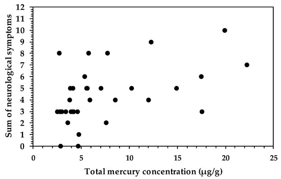 In general, symptoms occur and progress more rapidly the higher the concentration of mercury encountered. Figure 6 demonstrates the relationship between the sum of neurological symptoms and the increase of total mercury concentration. There was significant correlation between the sum of neurological symptoms and the increase of total mercury concentration (Pearson, r = −0.49; p = 0.004). Several studies reported significant correlation between mercury intoxicated symptoms and hair mercury concentration [3,22,35,36,37]. Other studies showed a lack of correlation between the symptoms and mercury level in the hair [8,38]. Of the possible reasons for this is that the body retention of mercury in an individual depends on dietary and physiological factors that can modulate the metabolism of nutritive or toxic metals [39].