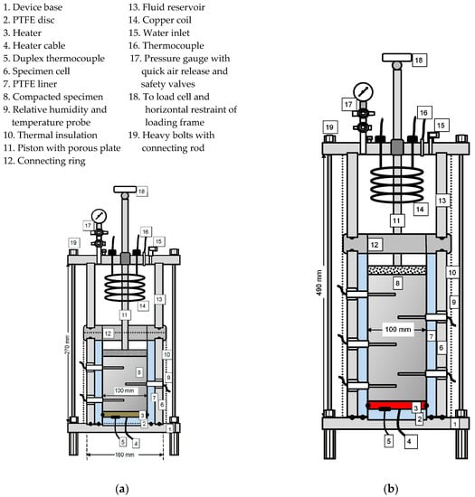 Two types of thermo-hydraulic column cells (TH column cells) were used in this study. The schematic diagrams of the devices are shown in Figure 1. For the tests at 85 °C, a TH column cell (Device A in Figure 1a) proposed by Tripathy et al. [18] was used, whereas several new TH column cells were fabricated and used for the tests at 150 °C (Device B in Figure 1b). The devices enabled applying both thermal and thermo-hydraulic gradients, and facilitated measuring the relative humidity and the temperature at predetermined locations along the depth of specimens and the axial stress at the top of the specimens.