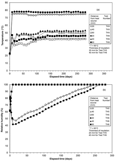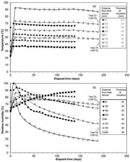 The applied temperature and the thickness of insulation layer influenced the relative humidity equilibrium time (Figure 2b and Figure 3b). In general, the relative humidity increased and then decreased with an elapsed time at all predetermined depths, with an exception in case of Test T4 (applied temperature = 150 °C), in which case the relative humidity increased with an elapsed time at distances of 180 and 240 mm from the heat source. For Tests T1 and T2 the relative humidity at all predetermined depths equilibrated within 95 and 142 days, respectively. The relative humidity at all predetermined depths in case of Tests T3 and T4 did not attain equilibrium for the duration of the tests considered in this study. The test results showed that a longer time may be required for the equilibration of the relative humidity when the applied temperature is 150 °C.