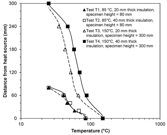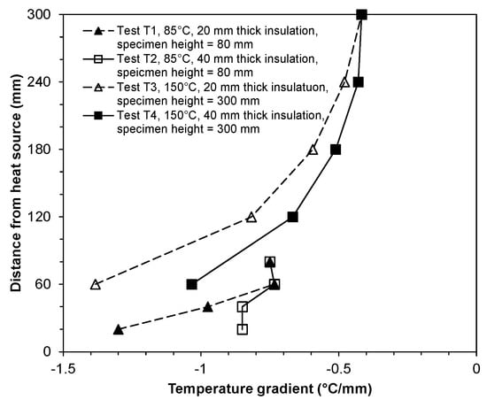 Figure 5 shows the equilibrium temperature gradients within the specimens. It can be seen in Figure 5 that for the constant applied temperature gradients across the specimens (−0.75 °C/mm and −0.42 °C/mm for applied temperatures of 85 and 150 °C, respectively), there are differences in the gradients of temperature throughout the bentonite columns. The temperature gradient decreased as the distance from the heat source increased. The results show that heat flow within the bentonite columns under non-isothermal loading condition was not one-dimensional. The temperature gradients at various distances from the heat source remained between −1.3 and −0.75 °C/mm for the specimens that were subjected to a temperature of 85 °C (i.e., for Tests T1 and T2). Similarly, the temperature gradients for the specimens at various distances from the heat source in Tests T3 and T4 remained between −1.4 and −0.42 °C/mm. Due to a reduction in the radial heat loss, at any distance from the heat source the temperature gradient for the tests with a 40 mm thick insulation was smaller (i.e., less negative). Comparing the temperature gradients in Tests T1 and T2 with Tests T3 and T4, it can be seen that for distances less than 60 mm from the heat source, an application of a temperature of 150 °C introduced higher temperature gradients in the compacted bentonite specimens. The profiles of thermal gradients in Figure 5 are expected to impact the moisture vapour redistribution within compacted bentonites.