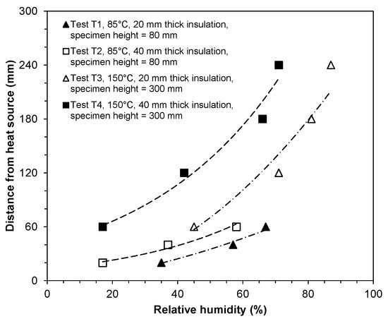 Figure 6 shows the relative humidity profiles of the bentonite specimens in Tests T1–T4. The relative humidity profiles correspond to the times at which the tests were terminated (Table 1). It can be seen from Figure 6 that the relative humidity within the specimens increased with an increase in the distance from the heat source indicating that a transfer of moisture vapour took place due to the application of the thermal gradients. For any applied temperature (85 °C or 150 °C), the relative humidity at all distances from the heat source was greater for the tests that were conducted with a 20 mm thick insulation as compared to that of the tests with a 40 mm thick insulation.