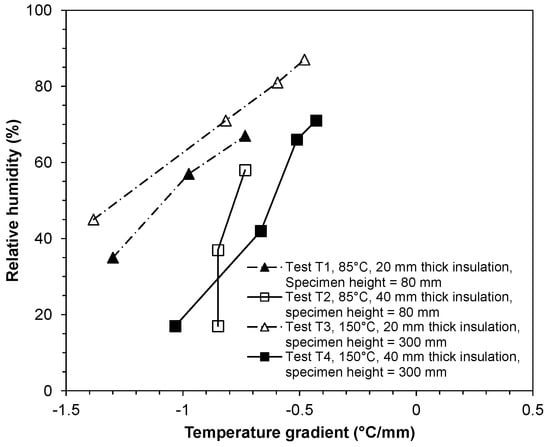 Figure 12 shows the relative humidity values recorded prior to termination of the tests. The relative humidity in case the specimens tested at a temperature of 85 °C reached 100% at the end of the tests and hence the results are not included in Figure 12. The thermal and hydraulic gradients influenced the evolution of the relative humidity profiles. The relative humidity increased with an increase in the distance from the heat source. The durations of tests and the applied water pressures did not significantly influence the relative humidity profiles. The relative humidity profiles were found to be linear.