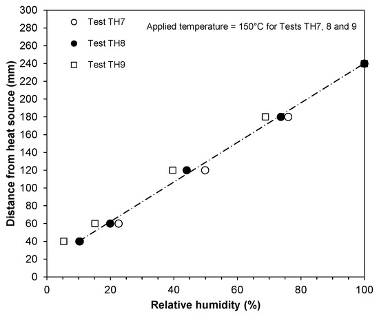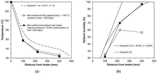 The shapes of relative humidity profiles for non-isothermal and non-isothermal hydraulic tests (Figure 6 and Figure 12) are found to be dissimilar. A generalized two parameter model (Equations (2)) was used to best-fit the relative humidity profiles, as shown in Figure 6. The model parameters are shown in Table 3. In all cases, very high values of the coefficients of regression were found. Equation (2) can be used to estimate the distance at which a specific value of the relative humidity will prevail or the relative humidity at any distance from the heat source. The parameters shown in Table 3 are for the duration of the tests considered in this study and hence may not be reliable for calculating the relative humidity at equilibrium conditions for the non-isothermal applied boundary condition. The relative humidity profiles for Tests TH7, TH8, and TH9 (Figure 12) were best fitted with a linear relationship (Equation (3)).