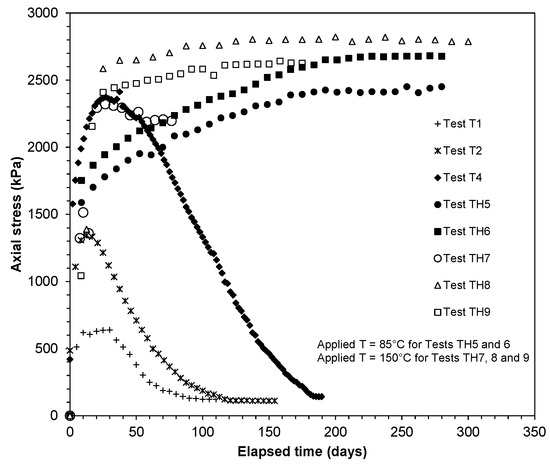 Figure 14 shows the elapsed time versus the measured axial stress for the compacted bentonite specimens tested in this study. Due to a technical fault in the load cell, the axial stress in Test T3 at 150 °C (20 mm thick insulation) could not be recorded.