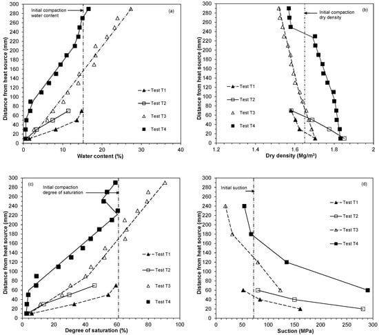 For the non-isothermal test results shown in Figure 15, the water content and degree of saturation at all salient levels in Test 2 remained smaller than Test 1. Similarly, the water content and degree of saturation at all salient levels in Test 4 remained smaller than Test 3. The degree of saturation for the non-isothermal tests remained below 100% indicating that the bentonite specimens remained unsaturated. The test results presented in Figure 15 in terms of the water content, dry density, degree of saturation, and suction complement well the results presented in Figure 4 and Figure 6 in terms of the profiles of temperature and relative humidity. For example, consider either Tests T1 and T2 or T3 and T4. At any given distance from the heat source, the specimens tested with a 40 mm thick insulation had lower relative humidity as compared to that of the specimens tested with a 20 mm thick insulation. The water content was found to be lower in case of Test T2 than T1 and lower for Test T4 than T3. The suction profiles that were established from the relative humidity and temperature profiles of the specimens agree well with the water content and degree of saturation profiles (Figure 15a,c).