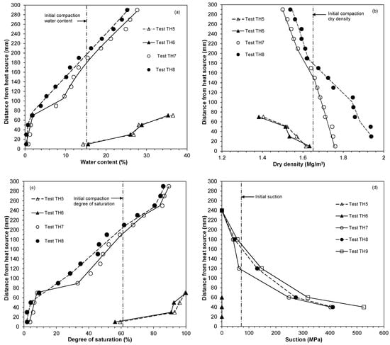 The results presented in Figure 15 and Figure 16 indicate two distinct aspects, such as (i) towards the opposite end of the heat source, the bentonite specimens underwent a wetting process as indicated by an increase in the water content, a decrease in the dry density, an increase in degree of saturation, and a decrease in suction and (ii) towards the heat source the specimens underwent a shrinkage process as indicated by a decrease in the water content, an increase in the dry density, a decrease in the degree of saturation and an increase in suction.