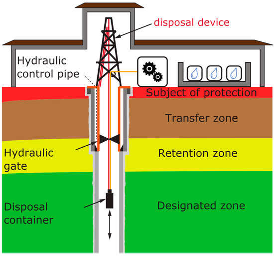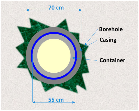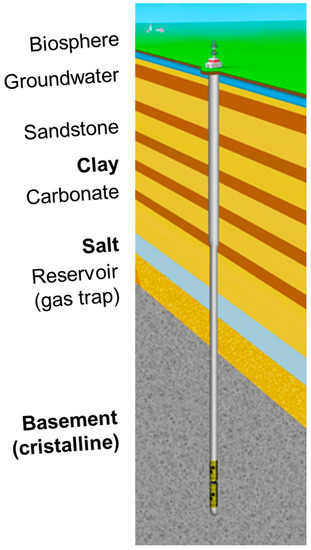 The maximum depth should be optimized by assessing state-of-the-art drilling, disposal technology, and the outcome of safety analyses. Vertical borehole and inclined boreholes, as well as multiple and deviating boreholes, are possible [10,11]. The generic concept with a vertical borehole is depicted schematically in Figure 1.