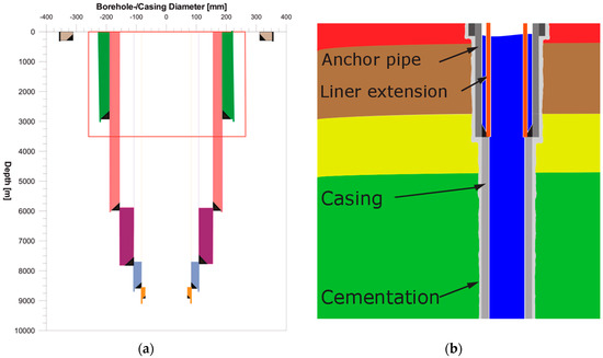 Schematic casing of the KTB site (a) and sketch with liner extension (b).