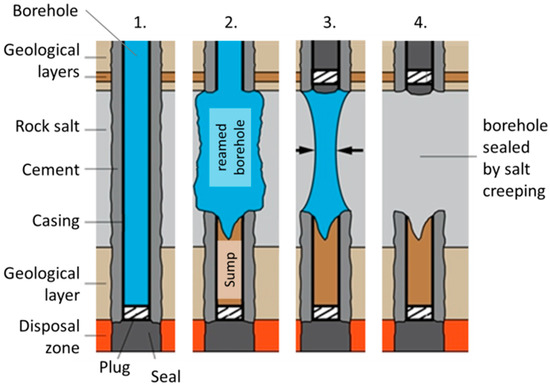 After completion of disposal and cementation of the well within the designated zone, boreholes should be fully sealed and abandoned. Borehole seals should ensure that there is no intrusion of groundwater into the disposal zone and that no contaminants from the disposal zone are released towards the subjects of protection via the boreholes. The seals shall re-establish the main characteristics of the geological barriers drilled through. Sealing of the borehole may be achieved in several ways with materials of proven long-term stability (salt, clay, bitumen) and over the entire length of the borehole. A favorable method for sealing a borehole utilizes the creep behavior of salt rock at greater depth and thus higher temperature [21], which is intended in the concept.