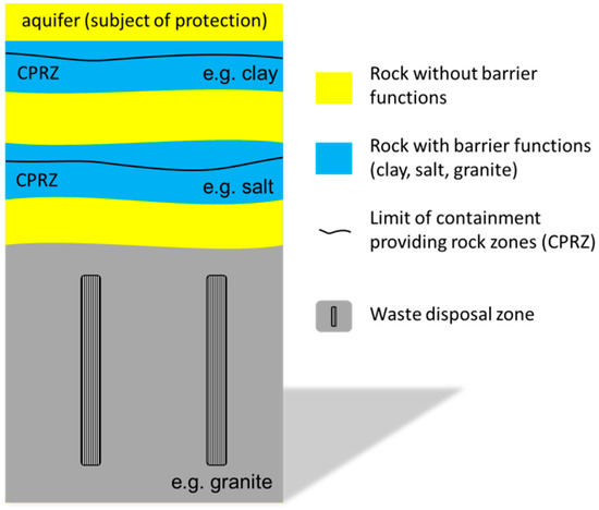 The containment-providing rock zone (CPRZ) is a key element of the safety requirements [2]. The concept for borehole disposal can take advantage of multiple geological barriers such as clay or salt rock layers, which can be used to define multiple and different possible CPRZs of types A (enclosure of waste by CPRZ in the host rock) or Bb (large lateral extension of CPRZ overlying the waste in the host rock) [22], besides others [12]. If disposal takes place directly in a salt or clay formation, type A is possible. Disposal in a crystalline rock should have at least a CPRZ of type Bb if no containment is provided by host rock or technical barriers [8].