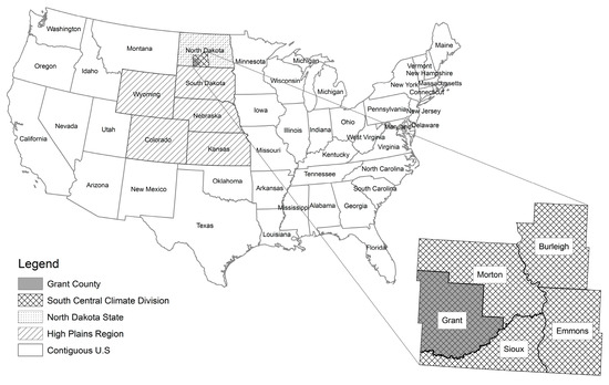 Drought intensity categories used in this study are from USDM defined as; abnormally dry (D0), moderate drought (D1), severe drought (D2), extreme drought (D3), and exceptional drought (D4). The detailed information about the drought intensity classification and USDM products can be found in the USDM website [46]. National, regional, state, climatic division, and county levels of spatial magnitude were chosen for the study. Contiguous U.S., High Plains Region (HPR), North Dakota (ND) State, South Central Climate Division (SCCD) in ND, and Grant County in ND were the areas selected to study drought characteristics variation under different spatial scales (Figure 1). Percentage area coverage values for different drought intensity categories were derived for years 2000–2014 (15 years) from the USDM web portal for selected spatial scales.