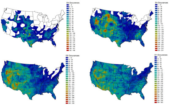 Drought occurrence (in number of weeks) in the contiguous U.S. is shown in Figure 2. Figure 2 shows the distribution of drought occurrences for intensity categories D4, D3, D2, and D1 during the years 2000 to 2014 (783 weeks). Mapping the occurrences of drought using USDM data helps identify the areas that are vulnerable to droughts. In the contiguous U.S., during the years 2000 to 2014 about half of the (51.7%) area had experienced D4, and almost the entire area (99.8%) experienced D1 at least once (Figure 2). D3 and D2 drought occurred at least once in 86.4% and 97.4% of the area, respectively. The southern part of the contiguous U.S. has experienced high intensity droughts (D3 and D4) in the study period, whereas some areas, including areas in north-eastern part, have been free of high intensity droughts. Each drought occurrence had a different spatial pattern. Parts of several counties (Wilbarger, Wichita, and Baylor in Texas, and Tillman in Oklahoma) experienced D4 intensity drought with a range of 168–156 weeks (out of 783 weeks) (Figure 2). Other areas that were affected by D4 for at least 96 weeks during years 2000 to 2014 can be found in Colorado, Idaho, Montana, New Mexico, Oklahoma, Texas, and Utah states (Figure 2). Frequent occurrences of D3 are mostly in the western U.S. Parts of counties (Pershing and Humboldt in Nevada, and Apache in Arizona) experienced D3 drought between 223 to 231 weeks out of 783 weeks. The areas that had been hit by D3 more than 130 weeks during years 2000 to 2014 can be found in Alabama, Arizona, Colorado, Georgia, Idaho, Kansas, Montana, Nebraska, Nevada, New Mexico, Oklahoma, Oregon, South Carolina, South Dakota, Texas, Utah, and Wyoming states (Figure 2).
