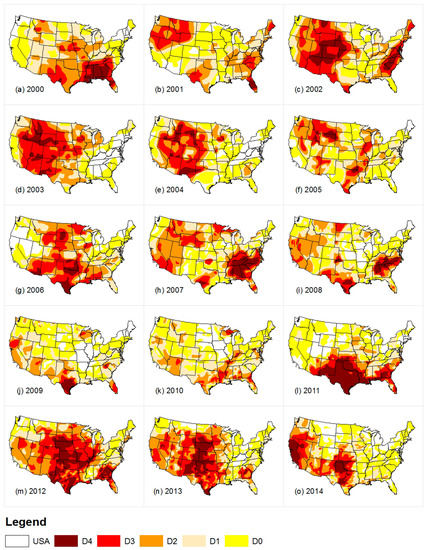 The contiguous U.S. has experienced several drought episodes during the study period (2000–2014). In this part of the study, the goal was to analyse the occurrences of different drought intensity categories. The weekly USDM GIS shapefiles were obtained from the USDM web portal for the years 2000 to 2014 and were assessed in ArcGIS10.3®. A series of batch commands were executed to clip the shapefiles into contiguous U.S., and extract areal extents pertinent to different USDM drought intensity categories (i.e., D0, D1, D2, D3, and D4).