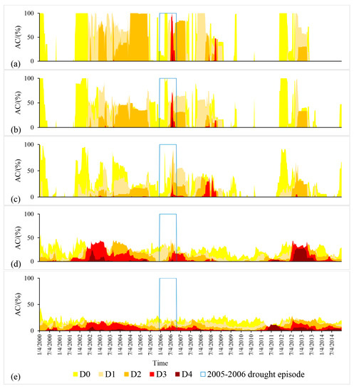 Propagation of areal coverage (AC) of different intensity category droughts over (a) Grant county, ND; (b) SCCD, ND; (c) ND State; (d) HPR; and (e) the contiguous U.S.