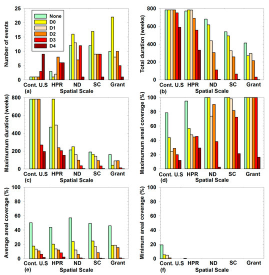 The number of events for the D0 condition appears to be increasing from a larger spatial scale to a smaller spatial scale. However, for all other drought conditions, the number of events do not show any relation to spatial scales (Figure 6a). The total and maximum duration for all conditions are decreasing from larger to smaller spatial scales (Figure 6b,c). It was an expected observation since smaller spatial scales are a subset of larger spatial scales. The average areal coverage of drought conditions did not show any trends related to spatial scales (Figure 6e). The maximum percentage area coverages were increasing from the larger spatial scales to smaller spatial scales for the “None”, D0, and D1 conditions (Figure 6d). All the spatial scales had been free of D4 and D3 at least once, as seen in the minimum area percentage coverage. All the spatial scales except the contiguous U.S. had been totally covered by D0 or high intensity drought at least once (i.e., zero percentage covered by “None”) whereas in the contiguous U.S. 80.75% had been covered by D0 or a high intensity drought at least once (i.e., 19.25% covered by “None”). The minimum percentage area coverages of D0 for the contiguous U.S. and HPR were 5.42% and 0.38%, respectively. The other spatial scales were devoid of the D0 category at least once. A section of the contiguous U.S. was covered by the D1 and D2 categories, at 4.80% and 1.08% areal extents, respectively, and all the other spatial scales were free of D1 and D2 at least once. In general, the minimum areal percentage coverages are decreasing towards the smaller spatial scales (Figure 6f).
