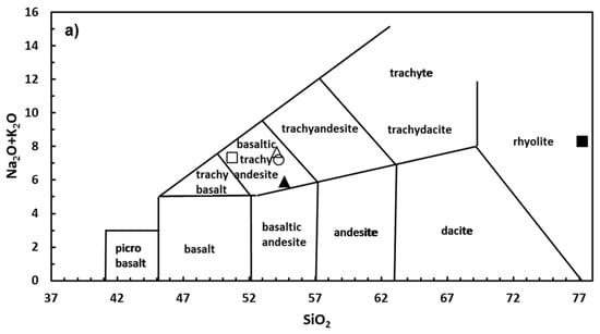 - Le Bas, M.J.; Le Maitre, R.W.; Streckeisen, A.; Zanettin, B. A chemical classification of volcanic rocks based on the total alkali-silica diagram. J. Petrol. 1986, 27, 745–750. [Google Scholar] [CrossRef]
