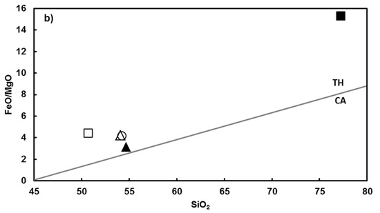 - Miyashiro, A. Volcanic rock series in island arcs and active continental margins. Am. J. Sci. 1974, 274, 321–355. [Google Scholar] [CrossRef]