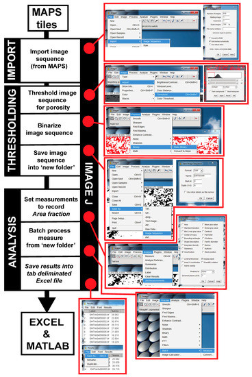 Flow diagram showing methodology for batch processing of image tiles within ImageJ, to extract numerical porosity data for contouring within MATLAB. Red boxes highlight screenshots of workflow within ImageJ.