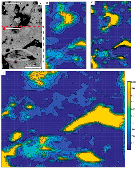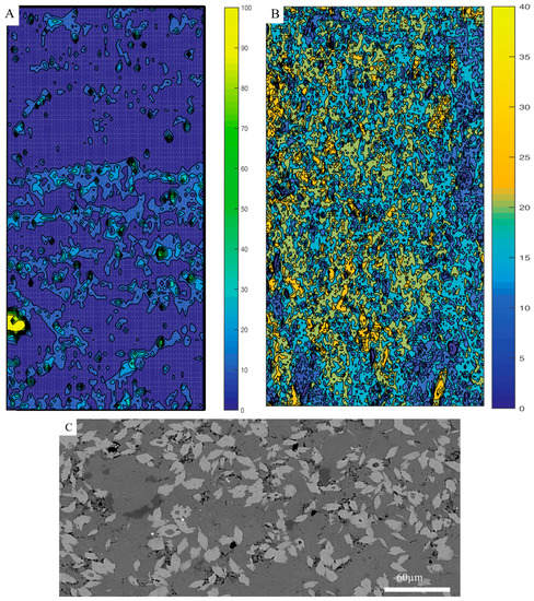 The array is then saved in the Excel file and transferred to MathWorks MATLAB R2014b (version 8.4.0.150421, 64 bit, MathWorks Inc., Natick, MA, USA). In MATLAB the plotting function “Contourf” is used to produce colored contoured representations of the variation in recorded porosity. Plotted data require reorientation and resizing to reflect the original disposition of the montaged BSE parent image (Figure 4c).