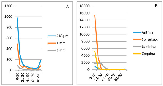 Percentage porosity frequency data plotted at 10% intervals for (A) comparison between Antrim samples with tile sizes of 518 µm, 1 mm and 2 mm; (B) Antrim, coquina, Spireslack and laminite, with tile sizes of 518, 518, 259 and 50 µm, respectively.