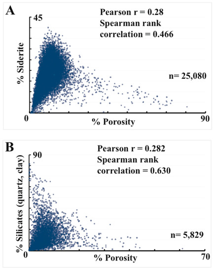 (A) Plot of percentage porosity versus percentage siderite, from Spireslack limestone, showing strong clustering with a positive correlation. (B) Plot of percentage porosity versus percentage silicates (quartz and clays), from coquina sample. Data appears visually to be clustered (with some lateral ”wings”) and a positive correlation. Both show statistically significant positive relationship with Pearson r and Spearman rank correlation. Also note the high sample number (n) particularly in (A).