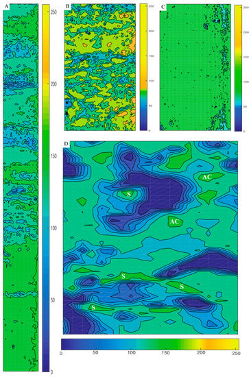 Maps based on mean grayscale (Figure 11) have the advantage of not requiring thresholding or binarizing. They are therefore marginally quicker to construct and are not affected by operator decision processes, thus being more reproducible. Although some of the grayscale maps appear to show close similarity to maps for porosity (Figure 11a,b,d), information that can be extracted is less targeted, potentially reflecting a combination of multiple parameters including mineral composition, as well as porosity. In the case of the Antrim aragonite cemented sandstone, the mean grayscale map (Figure 11d) exhibits components that match porosity, some that reflect areas with higher levels of cementation or calcite shelly material. Mean grayscale contoured maps cannot be taken as direct analogues for porosity, and may prove harder to take simple interpretations from. Factors that may have to be taken into consideration include the degree of BSE contrast between mineral phases present, and the level of contrast between pores and matrix.