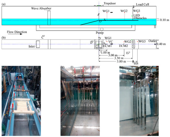 High-discharge flume at Waseda University: (a) side view of the flume; (b) top view; and the view of the three subsequent images (c–e). The WG are shown as red circles, the ECM are shown as black dots. The coordinate system is indicated as a blue dotted line in (a,b).
