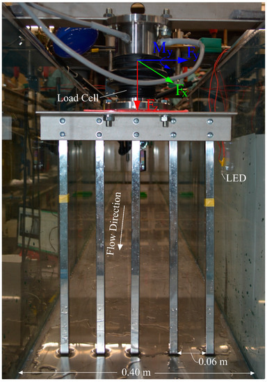 The obstacles to be impacted by the debris were modeled as a set of columns using a 1:50 length scale (Figure 2). The obstacles were modeled after structural columns in a building where breakaway walls had previously been destroyed by the inundating flow. The columns were 0.016 m wide with an opening width (W) of 0.06 m between each of the obstacles. The gap between the obstacles and the flume wall were 0.04 m on both sides and the obstacles were 0.40 m high. The width of the columns was chosen based on prescriptions from the National Building Code of Canada [31] corresponding to a general office building based on selected column spacing. The obstacles were placed 0.005 m above the bed surface to prevent them from touching the bed surface and thus influencing the force measurements from the load cell.