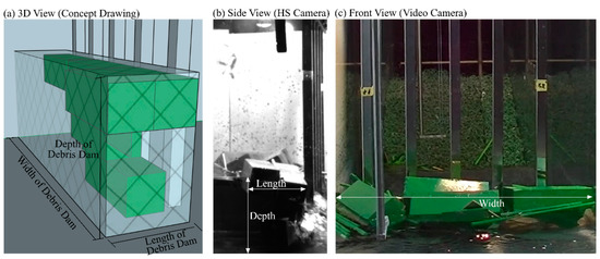 Measurement of debris dam dimensions using a two-camera system: (a) conceptual drawing of the dam dimensions; (b) image from the HS Camera; and (c) image from the video camera.