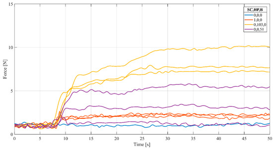 Force–time history of same volume cases and comparison with the base case without debris. The debris category is displayed in colors. The number of each type of debris is displayed within the legend (SC,HP,B).