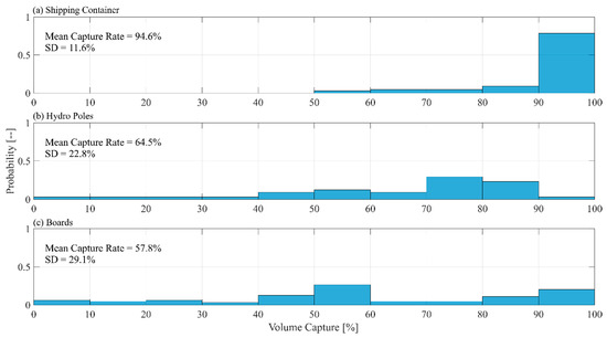 A comparison of the capture efficiency (the number of debris capture divided by the total number of debris) for each debris type for all the experiments (regardless of debris mixture) shows the influence of the physical properties of the debris (Figure 8). The probability in this case was the count of the number of experiments divided by the number of experiments that contained the debris type. The mean capture rate (average percentage of each type of debris captured in the experiment) and standard deviation (SD) are shown on each histogram. Due to the larger size of the shipping container, the debris was consistently captured with a significantly greater capture rate and less deviation, whereas the smaller characteristic length of the hydro poles and boards resulted in smaller capture rates with greater deviation between experiments.