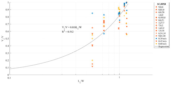 Equation (6) represents a deterministic evaluation of the volume capture as a function of the dimensionless characteristic length. However, as discussed earlier, debris transport is a stochastic process. The propagation orientation of the debris, which influenced weather the debris would contact the obstacle or not, is a probabilistic process influenced by a variety of factor, such as the flow conditions and surrounding topography [29]. As a result, significant scatter can be observed around the regression line. In this study, the characteristic length was calculated assuming that each side had an equal opportunity of forming the “key” log. Previous studies of debris transport have discussed the prevalence of a mean orientation [17] around which the likely debris orientations within the flow would be distributed. Detailed stochastic analysis of solid object orientation within the flow is needed to get a more accurate estimation of the characteristic length, something that is outside the scope of this study.