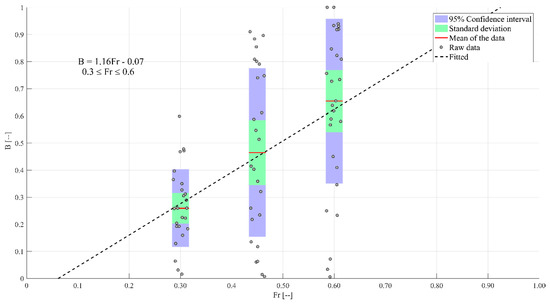 Considering Equation (1), an important aspect of the debris dam governing the debris loads is the transverse cross-sectional area of the dam. In the case of this study, the transverse cross-sectional area was designated by the width and depth. As the flow velocity influenced the formation of the dam, Figure 12 shows the cross-sectional area (a), normalized by the available cross-sectional area (), herein referred to as the blockage ratio (B), as a function of the Froude number.