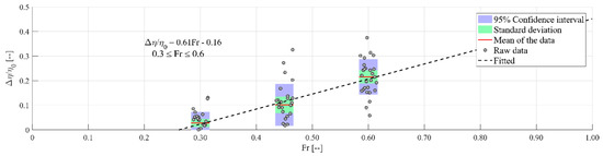 Using the momentum equations (Equation (2)), Fenton [23] showed that backwater rises as a function of the Froude number. Figure 13 displays the backwater rise, normalized by the initial water depth, as a function of the Froude number. The backwater rise showed a significant increase as the Froude number increased as expected due to the increase in the blockage ratio. Between a Froude number of 0.3 and 0.45, the backwater rise increased (t(8) = −5.433, p < 0.001) as well as between 0.45 and 0.6 (t(8) = −6.764, p < 0.001).