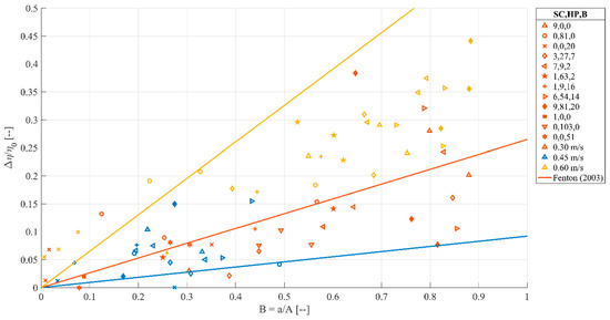 Backwater rise as a function of the blockage ratio. The backwater rise is compared to the analytical solution from Fenton (2003). The different debris configurations are displayed by differing symbols, the hydrodynamic conditions are displayed by color.