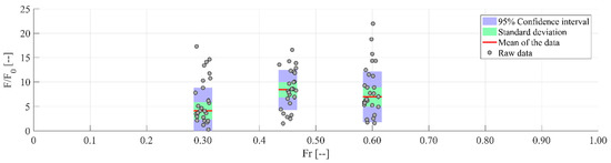 The discrepancy between the blockage ratio and force trends is likely a result of the backwater rise associated with the restriction of the channel caused by the dam. As discussed in the previous section, the backwater rise is a function of the Froude number. Following the continuity equations, as the water surface increased upstream of the dam, flow velocity decreased. Considering Equation (1), the drag force is influence by water depth by O(h), whereas the force is influenced by water velocity by O(u2). The decrease in flow velocity overcomes the increase cross-sectional area of the dam, resulting in the decrease in average force seen between 0.45 and 0.60. Between each case, no significant difference was observed. Significant deviation in equilibrium force values can be observed in all cases; however, this was most prominently observed for Fr = 0.6. Analyzing the results in Figure 12, the larger variation in the blockage ratio associated with the higher Froude number results in an associated increase in the deviation in measured forces.