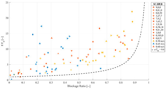 Due to the difference in the definition of flow velocity, a direct comparison to the Parola [20] framework was not possible. However, examining the trends observed in the Parola [20], for blockage ratios less than 0.36 showed significant deviation between experiments, resulting in the author taking a constant drag coefficient. For blockage ratios between 0.36 and 0.77, a distinctly negative trend could be observed, following by a leveling of the trend for blockage ratios between 0.77 and 1.