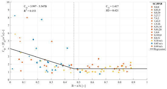 Quantitatively, the regression line displayed in Figure 17 does not represent well the experimental data (R2 = 0.153), suggesting that the mean of the data (CD,mean = 2.138, 95% CI (1.798, 2.477)) is a better representation of the drag coefficient. In the case of the smaller blockage ratios, the mean was difficult to assess due to large variations in the CD values. The smaller blockage ratios were a result of fewer debris being captured, with less compaction occurring. As the estimation of the drag coefficient was dependent on the exposed frontal cross-sectional area of the dam, less compaction would result in increased porosity of the dam and, therefore, the cross-sectional area would be less accurate than the highly compacted cases.