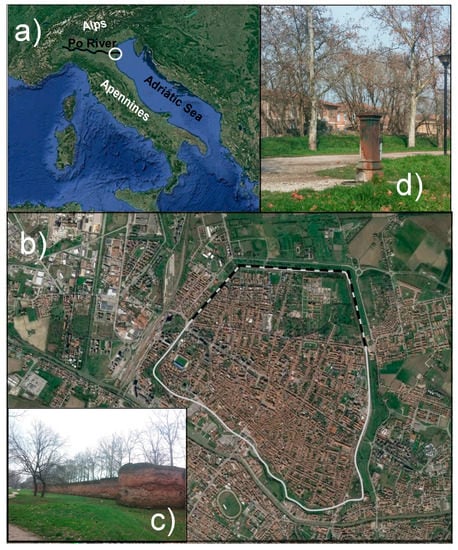 (a) Location map of Ferrara City (white circle); (b) Aerial view (extracted from Google Earth®) of the city of Ferrara and its walls; (c) City walls; (d) One of the two studied public drinking fountains.