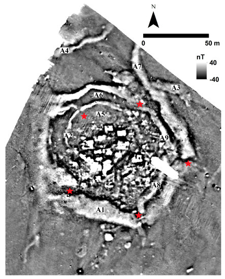 Finally, an empty zone (A5) to the north of the core of the settlement attracts attention. The zone is magnetically quiet suggesting a decision for keeping the area free of human occupation; or a “cleaning” prior to the destruction/abandonment of the settlement. A similar observation can be made for the arching space between the outer ditch (A6) and the wall-enclosure (A2).
