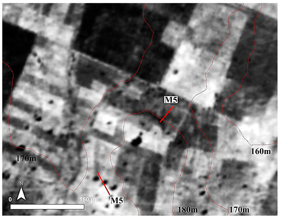 Historic aerial photography from 1945 shows two features (possibly enclosures) which are most probably related with the site (Figure 8). M5 (north) is a semi-arc bounding the settlement in the north. A high resolution Digital Terrain Model (DTM) acquired from the RPAS additionally supports the claim that M5 (north) was built in part of the site as the elevation contour of the settlement succinctly traces this feature (Figure 9). Furthermore, the extent of the site to the east and to the south as documented by the geomagnetic prospection (see below) merges with this feature, providing a better representation of the limits of the site.