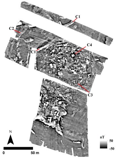 Within the habitation limits of the site, there are architectural features with visible internal partitions. Their magnetic signatures indicate that they had stone wall foundations and probably mudbrick walls and/or clay floors. A clear evidence for the former comes from C3 where the walls have apparent negative magnetic gradient within the clay rich soil, as suggested by the high magnetic susceptibility values of the background. Feature C4 provides evidence for burning; high magnetic values after burning with respect to the background indicates the architectural use of magnetically rich material, i.e., clay.