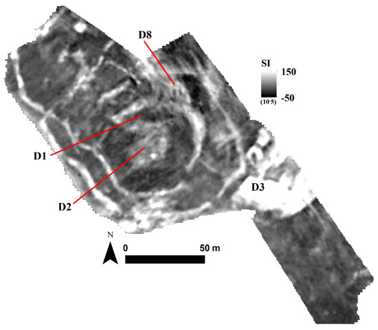 Due to its lower spatial resolution, the EMI survey does not provide architectural details of domestic dwellings. However, it further helps to discriminate buildings which faced pyro activities and their variable intensities. This is the most visible for the burnt structure, C4.