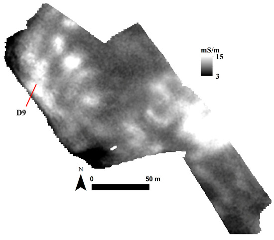 Electrical conductivity map shows a clear distinction between the northeast (resistive) and southwest (conductive) surroundings of the settlement (Figure 4b). As expected, the site itself is part of the high resistivity section, related to the compaction of the soil, due to intensive human activities of the past. It is possible that anthropogenic soils “spilled” towards northeast; or there was another locus of habitation in this area, as already suggested by the geomagnetic data.