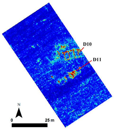 GPR signals document a structure with multiple rooms aligned in east–west direction (D10) and located at ~70–80 cm below the surface (Figure 17). The particular structure is located at the central section of the site, which was the locus of the GPR survey (Figure 18). The fact that this multi-room building is vaguely visible in magnetic data suggests intact, non-burnt architecture with substantial stone wall foundations. To the south of D10, there are indications of another structure (D11) with little to no preservation. This structure appears to be smaller than D10, but is still within the bounds of settlement core D2. There is no substantial evidence for built environments outside of the D2. This is particularly important for relative dating of the D1 with respect to D2. GPR signals do not pick up building material even at deeper levels within D1, supporting the hypothesis that D1 is dated to an earlier period than D2 and its associated ditch enclosures.